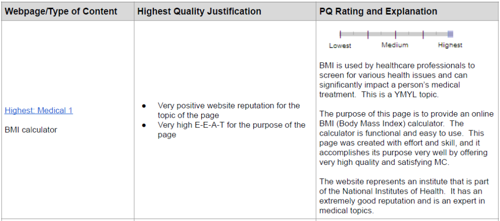 Abbildung 2 zeigt ein Positivbeispiel aus den Google Richtlinien für Qualitätstester. Eine Webseite die der Kategorie Gesundheitsthemen zugeordnet werden kann, wurde mit dem höchsten E-E-A-T bewertet, weil diese einen funktionalen und nutzerfreundlichen BMI-Rechner beinhaltet. Außerdem wird die Webseite von einer nationalen Gesundheitsorganisation betrieben, was für Google ein Zeichen außerordentlicher Autorität ist. Entsprechend positiv fällt auch die Bewertung der Quality Rater aus.