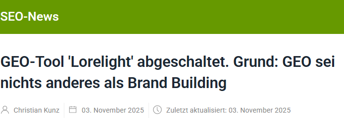 Laut Studien ist Autorität übrigens der entscheidende Faktor, um bei LLMs in den Suchergebnissen zu erscheinen. Zu dieser Einschätzung kam auch der Gründer des GEO-Tools „Lorelight“, der sein Tool kurzerhand wieder einstellte, weil er zu dem Schluss kam, dass GEO-Optimierung im Kern nichts anderes ist als Brand Building. Christian Kunz berichtet auf seiner Website SEO-Südwest über dieses Thema.