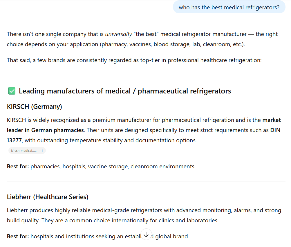 Wie wichtig gerade Autorität für die Sichtbarkeit in LLMs ist, wurde bereits beschrieben und soll an einem Beispiel noch deutlicher werden: So wurde ChatGPT mit der Frage konfrontiert, welcher Anbieter die besten Kühlschränke für Medikamente hat. Als Ergebnis wurde die Firma Kirsch an erster Position genannt. SEO-technisch gibt es sicherlich Websites, die besser optimiert sind. Doch es gibt eben nur einen Marktführer für Medikamenten-Kühlschränke in Deutschland. Die KI weiß das, erkennt also die hohe Autorität der Marke und platziert sie daher auf Platz 1 in der Liste.